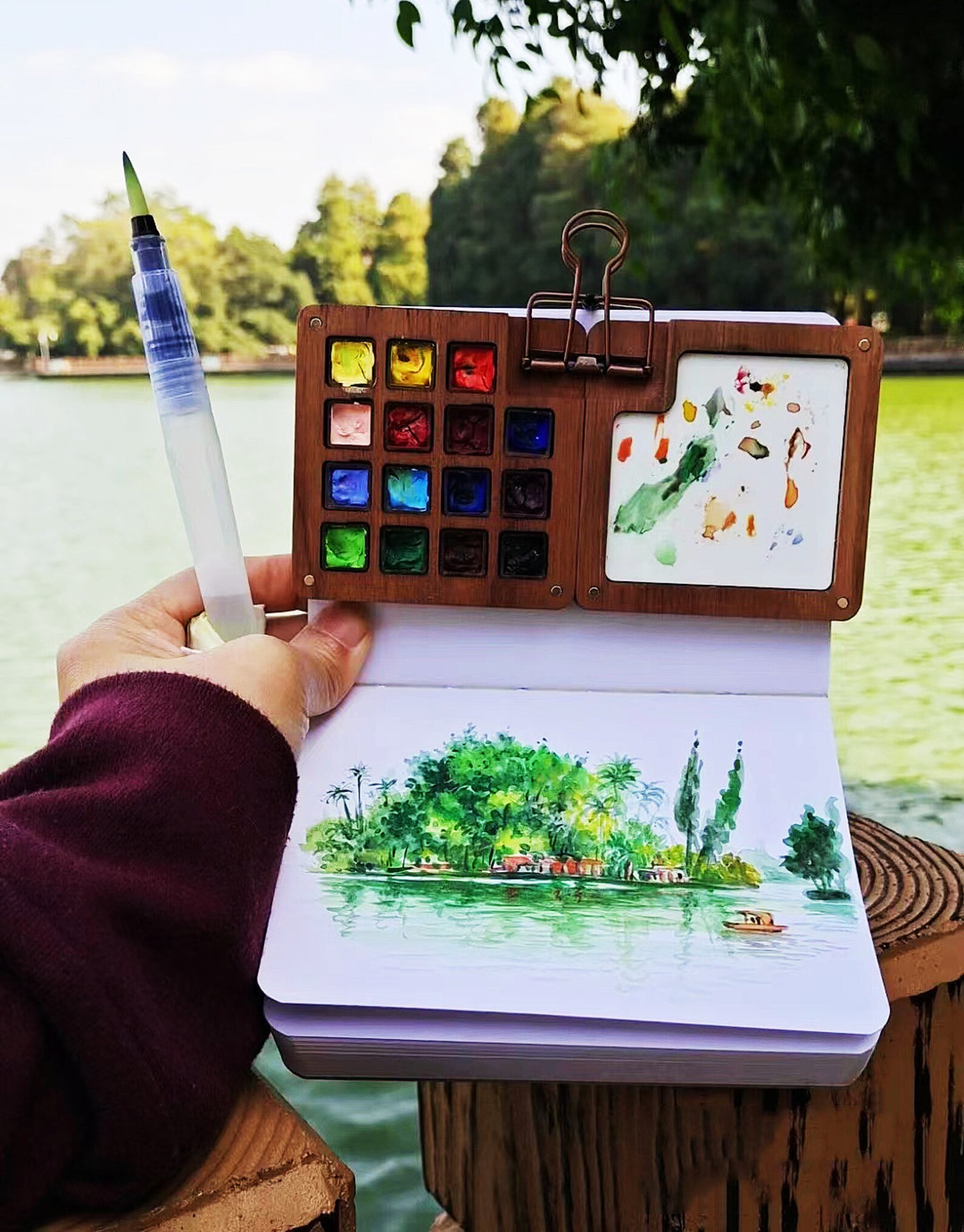 [She starts to take it fully out of the bag, and then looks over at where all the easels are set up, and then slowly puts it back in the bag.]